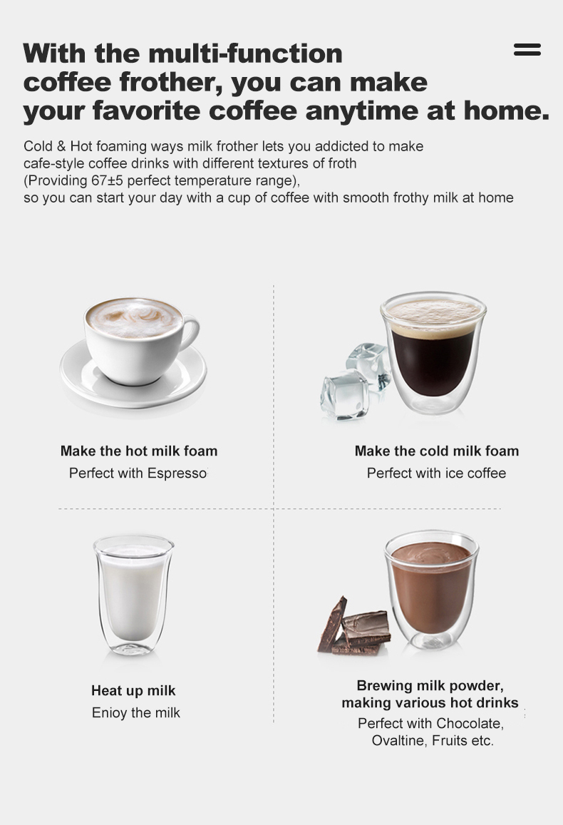 Cold milk foam for iced coffeeCertificates: BS EN55014, EMC ,LFGB FCC,Rohs UKCA Remarks: Giftbox (3-layers, double waves), Carton box (5-layers, double corrugated).